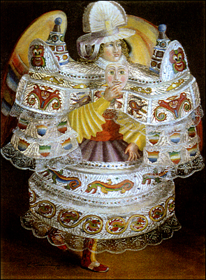 sincretismo mítico entre el señor Las alas con los colores del arco iris evocan el resurgimiento y el viaje extraordinario de la cosmovisión andina que queda aún en la memoria de los habitantes del Altiplano boliviano. El ropaje lujosamente adornado con hilos de color oro, plata y piedras preciosas simbolizan los astros; el sol, la luna y las estrellas. Ciertos